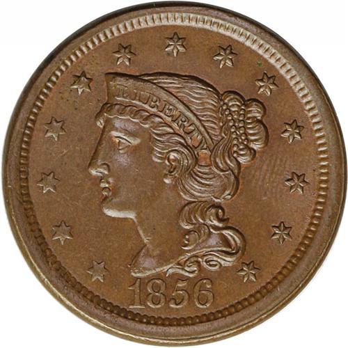 1856 1C Slanted 5. N-13, R.1. MS64 Brown NGC. AU58 EAC 1856[1C] Slanted 5. N-13, R.1. MS64 Brown NGC