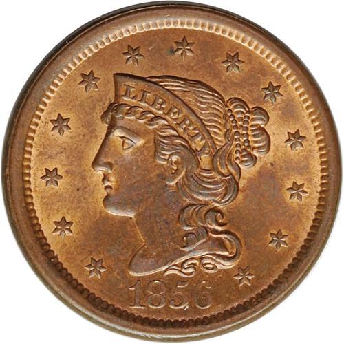 <B>1856<1C> Slanted 5. N-16, R.2. MS64 Red and Brown NGC. MS63+ EAC.</B></I> Grellman state c. The late die states of this variety used to be called N-15. A lovely example with nearly full mint red color on both sides. Almost Gem quality. Faint bluish-brown color on the obverse. Finer than Brown: 1505, called third finest known, and finest of the later die state.<BR><I>Ex: Howard R. Newcomb; Floyd T. Starr (Stack's, 6/14/1984), lot 831.</B></I>