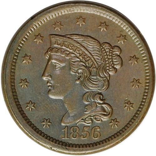<B>1856<1C> Slanted 5. N-2, R.1--Improperly Cleaned--NCS. Unc Details. AU50 EAC.</B></I> Grellman state e or f. The obverse die lines are gone, and the letters ED STATES are weaker than other letters. Olive-brown with considerable bluish-green toning, especially on the reverse.