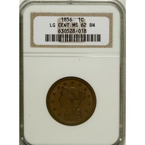 <B>1856 1C Upright 5 MS62 Brown NGC.</B></I> NGC Census: (194/906). PCGS Population (34/205). Mintage: 2,690,463. Numismedia Wsl. Price for NGC/PCGS coin in MS62: $160. (#1919)<BR><BR><b>Shipping:</b> Coins & Currency (<a target="_blank" href="http://www.heritageauctions.com/common/shipping.php">view shipping information</a>)
