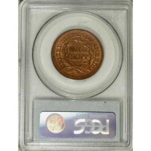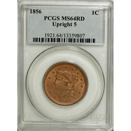 <B>1856 1C Upright 5 MS64 Red PCGS.</B></I> N-10, R.1. The Y of LIBERTY shows a strong line pointing up and to the right. This near-Gem example offers well-defined central devices and luminous, dusky copper-orange surfaces. Two small carbon spots are present between stars 8 and 9. Population: 15 in 64 Red, 6 finer (12/07). EAC 64.<BR><BR><B>Coin Engraver:</B> Christian Gobrecht<BR><BR><b>Shipping:</b> Coins & Currency (<a target="_blank" href="http://www.heritageauctions.com/common/shipping.php">view shipping information</a>)