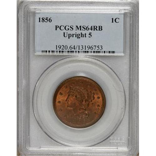 <B>1856 1C Upright 5 MS64 Red and Brown PCGS.</B></I> PCGS Population (132/32). NGC Census: (100/98). Mintage: 2,690,463. Numismedia Wsl. Price for NGC/PCGS coin in MS64: $420. (#1920)<BR><BR><b>Shipping:</b> Coins & Currency (<a target="_blank" href="http://www.heritageauctions.com/common/shipping.php">view shipping information</a>)