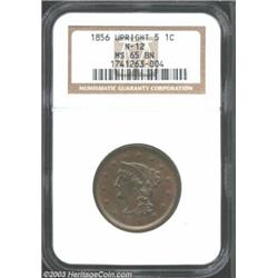 <TR><TD width="100%"><TABLE cellSpacing=1 cellPadding=3 width="100%" border=0><TBODY><TR><TD width="100%" bgColor=#79735c><FONT face=arial color=#ffffff size=3><B>Description</B> </FONT></TD></TR><TR><TD width="100%" bgColor=#ffffff><FONT face=arial size=2><B>1856 1C Upright 5 MS65 Brown NGC.</B></I> N-12. Boldly struck overall with smooth, chocolate-brown surfaces. No spotting is seen on either side. A perfect type coin selection. </FONT></TD></TR></TBODY></TABLE></TD></TR></TBODY></TABLE><BR><A name=PricesRealized></A><TABLE cellSpacing=0 cellPadding=0 width="100%" bgColor=#000000 border=0><TBODY><TR><TD width="100%"><TABLE cellSpacing=1 cellPadding=3 width="100%" border=0><TBODY><TR><TD width="100%" bgColor=#79735c><A name=PR><FONT face=arial color=#ffffff size=3><B>Previous Prices from Heritage Auctions</B> </FONT></A></TD></TR><TR><TD bgColor=#f6f6ed><TABLE cellSpacing=0 cellPadding=0 width="100%" border=1><TBODY><TR><TD align=middle width="33%"><B>Date</B></TD><TD align=middle width="33%"><B>Service</B></TD><TD align=middle width="33%"><B>Price</B></TD></TR><TR bgColor=whitesmoke><TD width="33%"><B>08/05/2000</B></TD><TD width="33%">PCGS</TD><TD width="33%">$517.50</TD></TR><TR bgColor=whitesmoke><TD width="33%"><B>05/05/2003</B></TD><TD width="33%">NGC</TD><TD width="33%">$437.00</TD></TR><TR bgColor=whitesmoke><TD width="33%"><B>04/05/2001</B></TD><TD width="33%">NGC</TD><TD width="33%">$402.50</TD></TR><TR bgColor=whitesmoke><TD width="33%"><B>08/08/1998</B></TD><TD width="33%">NGC</TD><TD width="33%">$385.00</TD></TR></TBODY></TABLE></TD></TR><TR><TD bgColor=#ffffff><FONT face=arial size=1 ?>PLEASE NOTE: All prices realized reflect the final hammer price PLUS the buyer's premium in auctions that charge a buyer's premium. Each item has a notation at the top of the listing indicating whether that lot included a buyer's premium. Example: A item that sells with a final hammer price of $100 and a 20% buyer's premium will display with a price realized of $120. All information listed is intended to be as accurate as possible, but errors are possible. Please use this guide carefully and inform us of any inaccuracies. </FONT></TD></TR></TBODY></TABLE></TD></TR></TBODY></TABLE><BR><TABLE cellSpacing=0 cellPadding=0 width="100%" bgColor=#000000 border=0><TBODY><TR><TD width="100%"><TABLE cellSpacing=1 cellPadding=3 width="100%" border=0><TBODY><TR><TD width="100%" bgColor=#79735c colSpan=6><FONT face=arial color=#ffffff size=3><B>Price Guide*</B> </FONT></TD></TR><TR bgColor=#f6f6ed><TD align=middle><B>Grade</B> </TD><TD align=middle><B>Coin World<BR>(Trends)</B> </TD><TD align=middle><B>Numismedia<BR>Retail</B> </TD><TD align=middle><B>Numismedia<BR>Wholesale</B> </TD><TD align=middle><B>Coin<BR>Universe</B> </TD><TD align=middle><B>Heritage<BR>Value Index</B> </TD></TR><TR bgColor=#ffffff><TD align=middle>64</TD><TD align=right>---</TD><TD align=right>$375.00</TD><TD align=right>$300.00</TD><TD align=right>$465.00</TD><TD align=right>$300.00</TD></TR><TR style="FONT-WEIGHT: bold" bgColor=#cccfdd><TD align=middle>65</TD><TD align=right>---</TD><TD align=right>$563.00</TD><TD align=right>$450.00</TD><TD align=right>$585.00</TD><TD align=right>$600.00</TD></TR><TR bgColor=#ffffff><TD align=middle>66</TD><TD align=right>---</TD><TD align=right>---</TD><TD align=right>$950.00</TD><TD align=right>---</TD><TD align=right>---</TD></TR><TR bgColor=#ffffff><TD colSpan=6><FONT size=1>*All information listed is intended to be as accurate as possible, but errors are possible. No item may be returned or refused based on this information which is provided as a service to our customers. You should contact each pricing source directly to determine the accuracy of this information. </FONT></TD></TR></TBODY></TABLE></TD></TR></TBODY></TABLE><BR><TABLE cellSpacing=0 cellPadding=0 width="100%" bgColor=#000000 border=0><TBODY><TR><TD width="100%"><TABLE cellSpacing=1 cellPadding=3 width="100%" border=0><TBODY><TR><TD width="100%" bgColor=#79735c><FONT face=arial color=#ffffff size=3><B>Population Guide</B> </FONT></TD></TR><TR bgColor=#ffffff><TD align=middle><!-- Begin Output of Population Grid--><TABLE cellSpacing=0 cellPadding=0 width="100%" border=0><TBODY><TR><TD vAlign=center><TABLE cellSpacing=0 width="100%" border=1 cellsadding="3"><TBODY><TR><TD vAlign=center><TABLE cellSpacing=0 cellPadding=3 width="100%" border=1><TBODY><TR><TD vAlign=center align=middle bgColor=#f0f1e8 colSpan=2 <CENTER><FONT face=Arial size=2><B>PCGS Pop </B></FONT><CENTER></CENTER></TD><TD vAlign=center align=middle bgColor=#f0f1e8 colSpan=2><CENTER><FONT face=Arial size=2><B>NGC Pop</B></CENTER></FONT></TD></TR><TR><TD vAlign=center><FONT face=Arial size=2>(65)</FONT> </TD><TD vAlign=center align=right><FONT face=Arial size=2>24</FONT> </TD><TD vAlign=center><FONT face=Arial size=2>(65)</FONT> </TD><TD vAlign=center align=right><FONT face=Arial size=2>79</FONT> </TD></TR><TR><TD vAlign=center><FONT face=Arial size=2>(>65)</FONT> </TD><TD vAlign=center align=right><FONT face=Arial size=2>1</FONT> </TD><TD vAlign=center><FONT face=Arial size=2>(>65)</FONT> </TD><TD vAlign=center align=right><FONT face=Arial size=2>29</FONT> </TD></TR></TBODY></TABLE></TD></TR></TBODY></TABLE></TD></TR></TBODY></TABLE><!-- End Output of Population Grid--></TD></TR></TBODY></TABLE></TD></TR></TBODY></TABLE><BR><TABLE cellSpacing=0 cellPadding=0 width="100%" bgColor=#000000 border=0><TBODY><TR> Important notice: We expect to be auctioning lots at the rate of 200-250 per hour. On occasion eBay live bid software cannot keep up with the pace of the auctions where 4-5 lots per minute can hammer down, so we recommend that you place a realistic absentee bid now as insurance to avoid disappointment. Also please note that all Heritage/CAA lots purchased through eBay Live carry a 20% Buyer's Premium. Please make sure you read the Terms and Conditions.