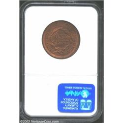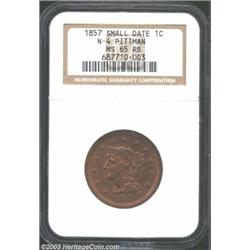 1856 1C Upright 5 MS65 Red and Brown NGC. N-6, R.1. Bright crimson color outlines the legends and devices. Most of the stars lack full centril details, but the portrait, wreath, and legends are bold. A faint handling mark below EN in CENT is barely worthy of individual mention. Important notice: We expect to be auctioning lots at the rate of 200-250 per hour. On occasion eBay live bid software cannot keep up with the pace of the auctions where 4-5 lots per minute can hammer down, so we recommend that you place a realistic absentee bid now as insurance to avoid disappointment. Also please note that all Heritage/CAA lots purchased through eBay Live carry a 20% Buyer's Premium. Please make sure you read the Terms and Conditions.