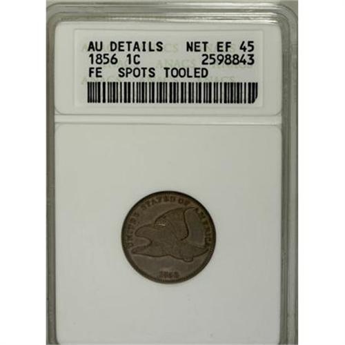 <B>1856 1C --Spots Tooled--ANACS. AU Details, Net XF45.</B></I> Snow-3. A lightly circulated but glossy olive-brown example. Clusters of pinscratches are present above the 185 in the date and on the reverse near 5 o'clock. A collectible example of this famous variety, the first and rarest small cent date.<BR><BR><B>Coin Engraver:</B> James B. Longacre<BR><BR><b>Shipping:</b> Coins & Currency (<a target="_blank" href="http://www.heritageauctions.com/common/shipping.php">view shipping information</a>)