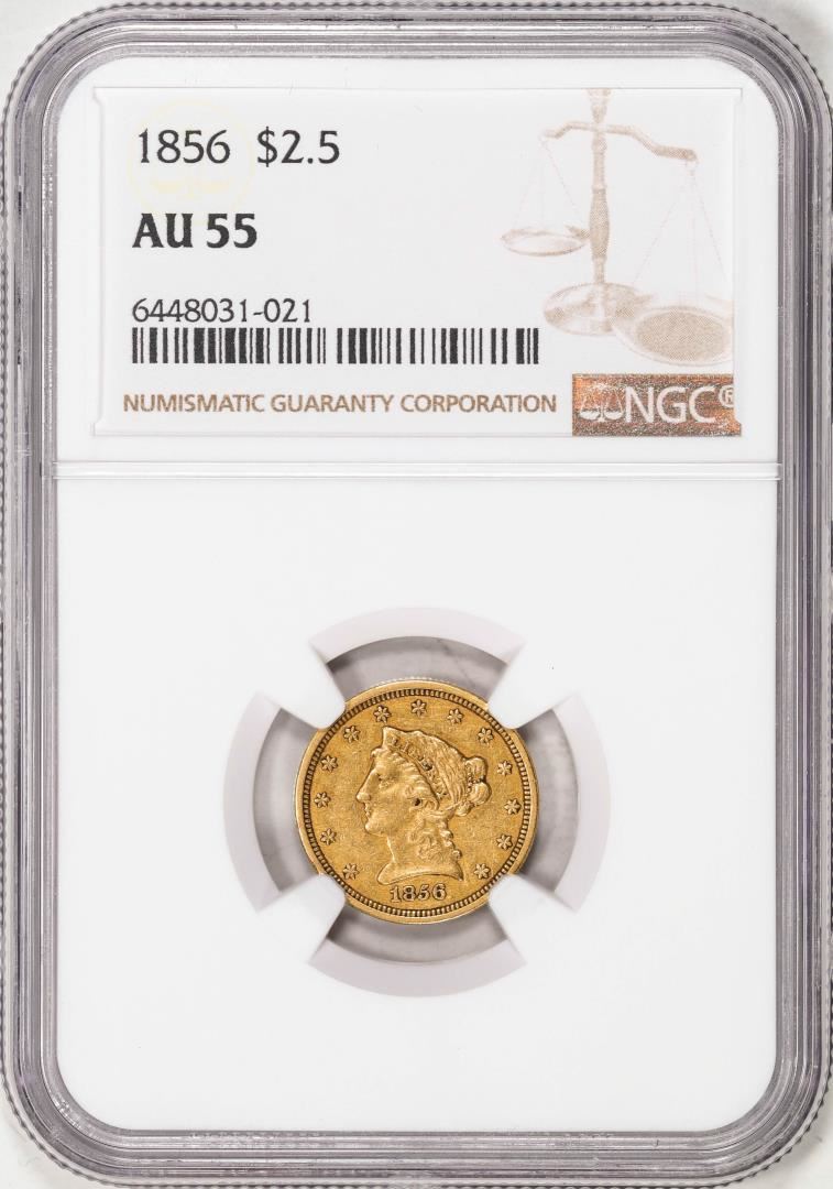 One 1856 $2 1/2 Liberty Head Quarter Eagle Gold Coin NGC AU55. NGC Certified.