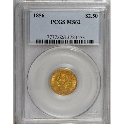 <B>1856 $2 1/2 MS62 PCGS.</B></I> A lovely khaki-gold representative with smooth devices and fields. Well struck aside from minor blending on the eagle's left (facing) leg. Population: 46 in 62, 51 finer (8/07).<BR><BR><B>Coin Engraver:</B> Christian Gobrecht<BR><BR><b>Shipping:</b> Coins & Currency (<a target="_blank" href="http://www.heritageauctions.com/common/shipping.php">view shipping information</a>)