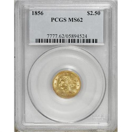 <B>1856 $2 1/2 MS62 PCGS.</B></I> PCGS Population (47/51). NGC Census: (99/45). Mintage: 384,240. Numismedia Wsl. Price for NGC/PCGS coin in MS62: $550. (#7777)<BR><BR><B>Coin Engraver:</B> Christian Gobrecht<BR><BR><b>Shipping:</b> Coins & Currency (<a target="_blank" href="http://www.heritageauctions.com/common/shipping.php">view shipping information</a>)