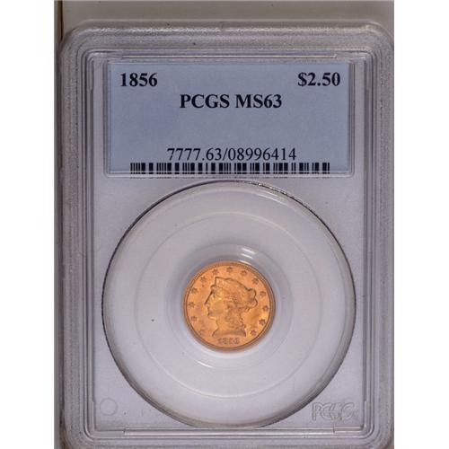 <B>1856<$2 1/2> MS63 PCGS.</B></I> A lustrous and lightly abraded example with deep reddish-golden color overall. Sharply struck except for the lower half of the eagle due to the reverse being struck from a badly clashed die. While the 1856 is a readily available date in circulated grades, it is infrequently encountered above basal Mint State grades. Population: 35 in 63, 21 finer (7/06).