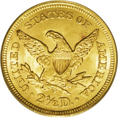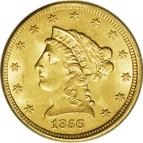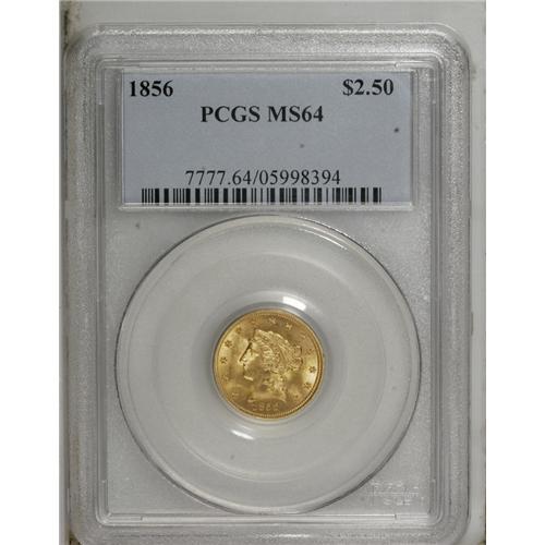 <B>1856 $2 1/2 MS64 PCGS.</B></I> A sharp strike and fully brilliant yellow-gold luster are the hallmarks of this Choice Mint State example. A small copper spot on the upper edge of the (facing) right wing will serve to identify this piece in the future. The mintage of 384,240 coins suggests that this is a common date, but few have survived as fine as this piece. Population: 16 in 64, 8 finer (10/06).<BR><BR><b>Shipping:</b> Coin/Currency (<a target="_blank" href="http://www.heritageauctions.com/common/shipping.php">view shipping information</a>)
