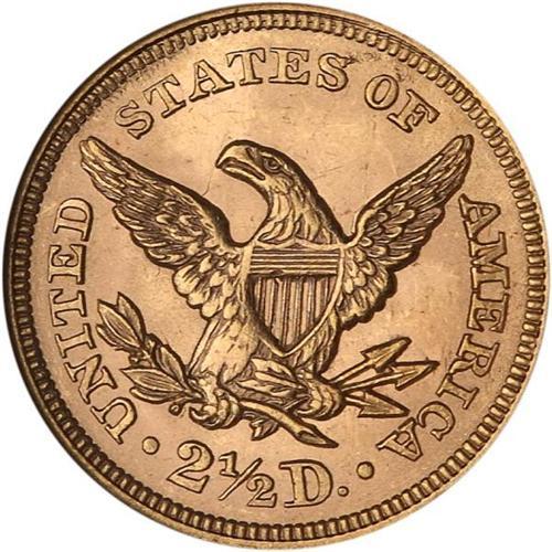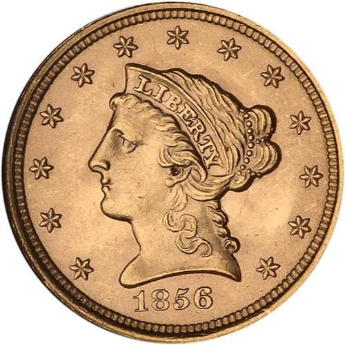 <b>1856 $2.50 Liberty. NGC graded MS65.</b> NGC Pop: 4/0. This issue isn't common despite its 384,240 minted, since the 1856 is usually found only in the various circulated grades. While relatively plentiful in the lowest Mint State grades, Gem quality examples are extremely rare and almost non-existent. The surfaces display attractive fresh golden color. Both the obverse and the reverse have preservation above and beyond the usual appearance, presenting a nicely frosted appearance. Overall, this is an exceptional 1856 quarter eagle, an important coin for the specialist, or for the type buyer who has a preference for select (and important) numismatic delicacies <b>(PCGS # 7777)</b> <i>
