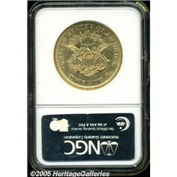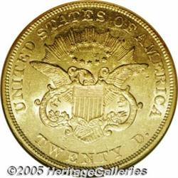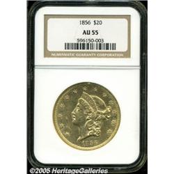 <B>1856 $20 AU55 NGC.</B></I> A Choice example that is highly lustrous with light yellow color and frosty surfaces. Both sides are moderately abraded, typical of the grade. A pleasing example that will be a wonderful addition to nearly any date or type collection.