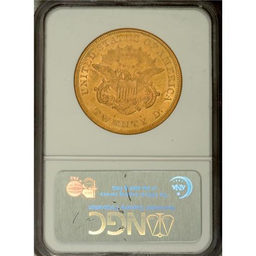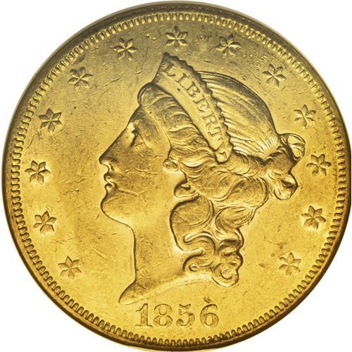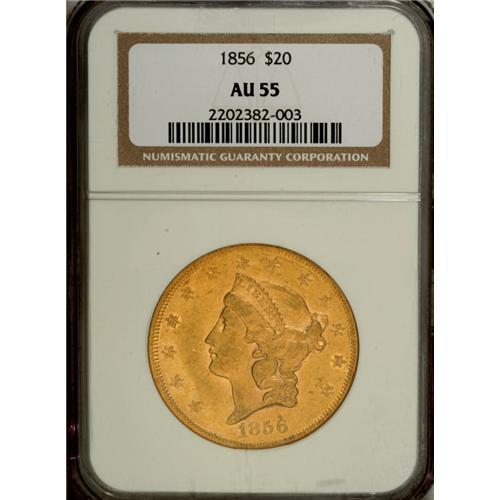 <B>1856 $20 AU55 NGC.</B></I> A well struck and typically abraded Philadelphia Mint piece. Light, even wear affects the devices, while the fields have strong peripheral luster that fades near the centers. At just under 330,000 examples coined, this issue has less than a third of the mintage of the San Francisco issue of this year.<BR><BR><b>Shipping:</b> Coin/Currency (<a target="_blank" href="http://www.heritageauctions.com/common/shipping.php">view shipping information</a>)