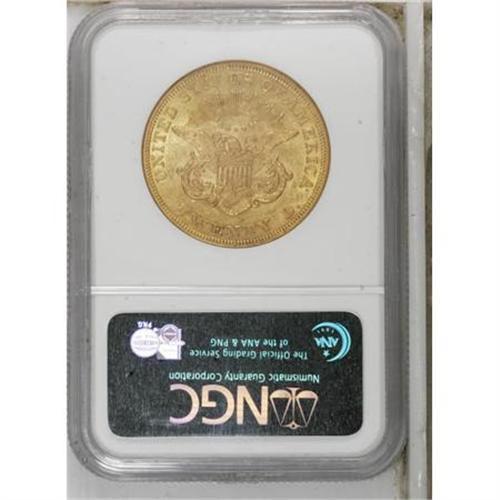 <B>1856 $20 AU55 NGC.</B></I> A still-lustrous pre-Civil War piece that has elegant antique-gold and butter-yellow color over each side, along with minor copper spots on the reverse. Well struck with only light abrasions and minimal wear on the devices.<BR><BR><b>Shipping:</b> Coins & Currency (<a target="_blank" href="http://www.heritageauctions.com/common/shipping.php">view shipping information</a>)