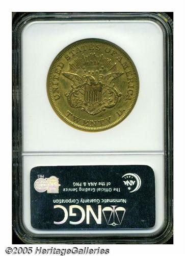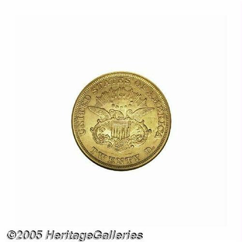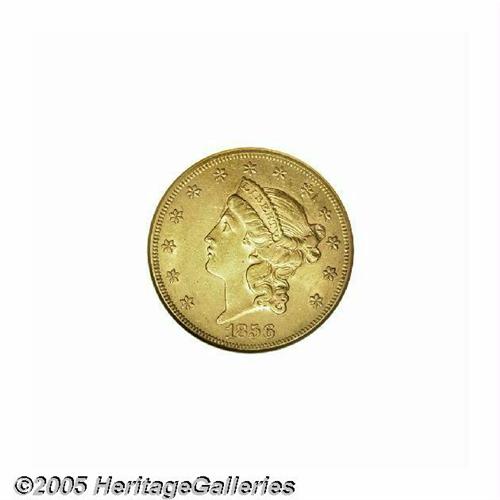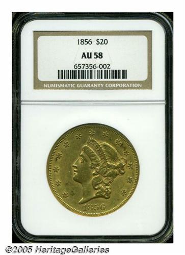 <B>1856<$20> AU58 NGC.</B></I> The 1856 is a scarce and underrated date among P-mint Type One twenties. It is scarce in all grades of AU with AU58 pieces being especially elusive--strict Mint State coins are notably rare. The striking details on this piece are uncommonly strong over each side, the peripheral stars on the obverse showing especially bold definition. Generous mint luster remains over both obverse and reverse with the green-gold color of the original coin having taken on an even overlay of reddish patina.