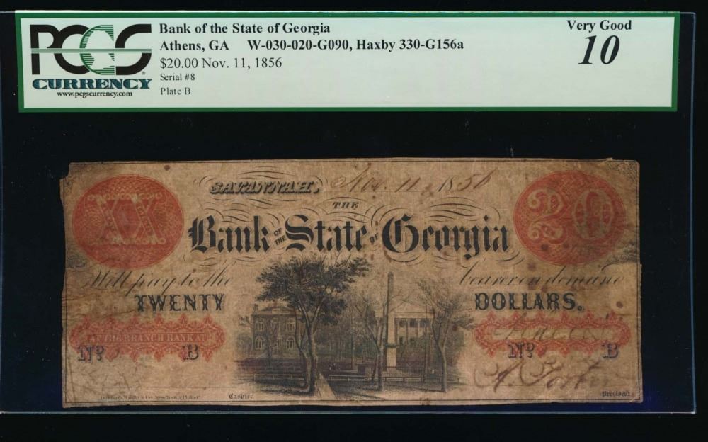One 1856 $20 Bank of the State of Georgia Obsolete Note PCGS 10.