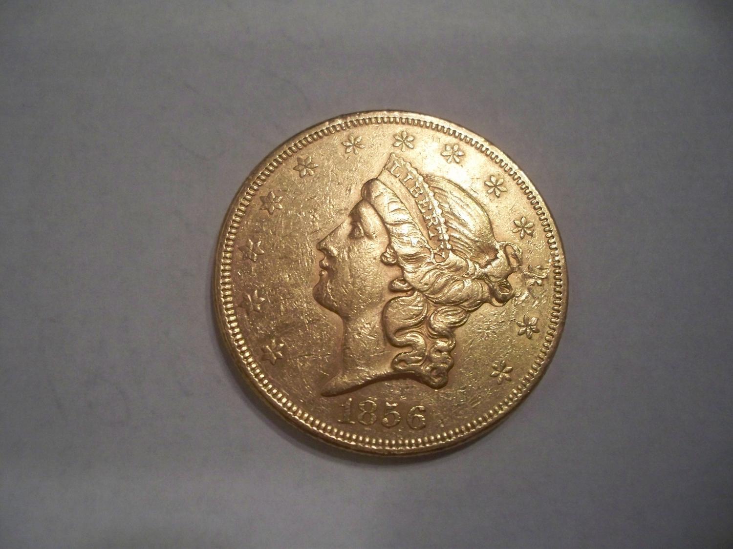 1856 $20 Gold Coin - Liberty Head Double Eagle without motto on reverse.