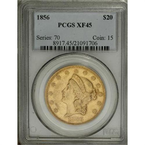<B>1856 $20 XF45 PCGS.</B></I> PCGS Population (44/72). NGC Census: (39/206). Mintage: 329,878. Numismedia Wsl. Price for NGC/PCGS coin in XF45: $800. (#8917)<BR><BR><B>Coin Engraver:</B> James B. Longacre<BR><BR><b>Shipping:</b> Coins & Currency (<a target="_blank" href="http://www.heritageauctions.com/common/shipping.php">view shipping information</a>)