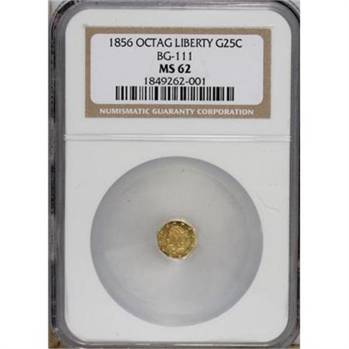 <B>1856 25C Liberty Octagonal 25 Cents, BG-111, R.3, MS62 NGC.</B></I> NGC Census: (10/17). PCGS Population (80/116). (#10380)<BR><BR><b>Shipping:</b> Coins & Currency (<a target="_blank" href="http://www.heritageauctions.com/common/shipping.php">view shipping information</a>)