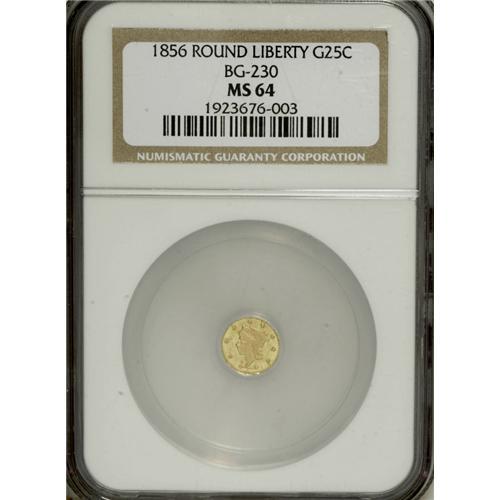 <B>1856 25C Liberty Round 25 Cents, BG-230, Low R.4, MS64 NGC.</B></I> The hazy yellow-gold surfaces of this interesting piece have modest reflectivity. A single abrasion on Liberty's cheek defines the grade. Census: 2 in 64, 2 finer (2/07).<BR><BR><b>Shipping:</b> Coins & Currency (<a target="_blank" href="http://www.heritageauctions.com/common/shipping.php">view shipping information</a>)