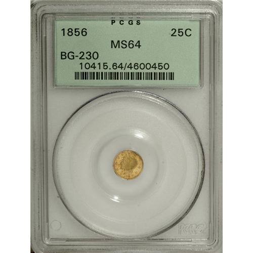 <B>1856 25C Liberty Round 25 Cents, BG-230, Low R.4, MS64 PCGS.</B></I> Die State II, with a network of bold die cracks on the cheek. Sharply struck and reflective with russet and apricot splashes over the bright straw-gold surfaces. A lintmark (as made) crosses the bust tip. Encapsulated in a green label holder.<BR><BR><b>Shipping:</b> Coins & Currency (<a target="_blank" href="http://www.heritageauctions.com/common/shipping.php">view shipping information</a>)