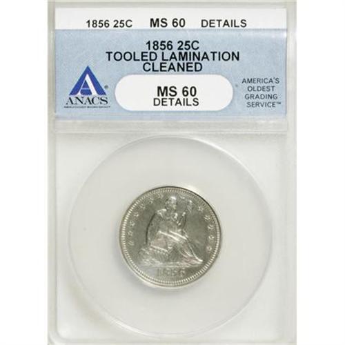 <B>1856 25C --Cleaned, Lamination, Tooled--ANACS. MS60 Details.</B></I> NGC Census: (1/81). PCGS Population (4/124). Mintage: 7,264,000. Numismedia Wsl. Price for NGC/PCGS coin in MS60: $285. (#5438)<BR><BR><B>Coin Engraver:</B> Christian Gobrecht<BR><BR><b>Shipping:</b> Coins & Currency (<a target="_blank" href="http://www.heritageauctions.com/common/shipping.php">view shipping information</a>)