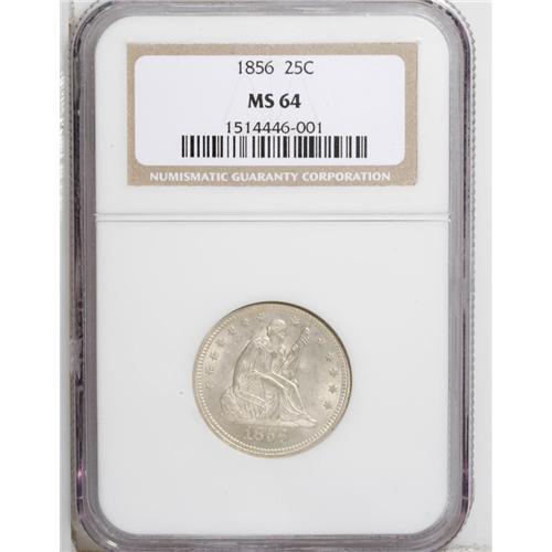 <B>1856 25C MS64 PCGS.</B></I> Delicate rose-gold toning graces this frosty antebellum beauty. Nicely struck with lovely luster and just a few small marks in the fields. Census: 21 in 64, 15 finer (9/06).<BR><BR><b>Shipping:</b> Coin/Currency (<a target="_blank" href="http://www.heritageauctions.com/common/shipping.php">view shipping information</a>)