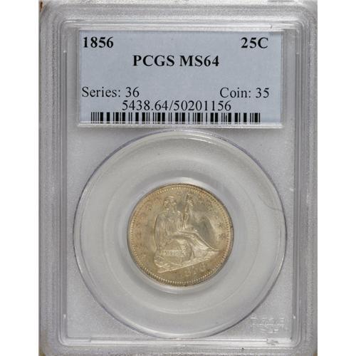 <B>1856 25C MS64 PCGS.</B></I> Medium gold toning lightens at the centers. A lustrous and attractively preserved near-Gem that has minor strike incompleteness on the lower half of the eagle and on the right side stars. Population: 36 in 64, 20 finer (1/07).<BR><BR><b>Shipping:</b> Coins & Currency (<a target="_blank" href="http://www.heritageauctions.com/common/shipping.php">view shipping information</a>)