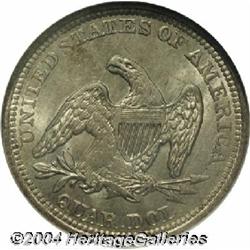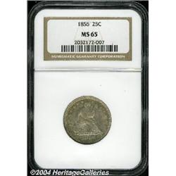 <B>1856<25C> MS65 NGC.</B></I> Lustrous and very clean with a thin coating of light gray-green toning over each side. The dentils and reverse peripheral letters are bold, but most of the star centers are weak, as are Liberty's breasts, the eagle's right leg, and the arrow feathers. The remaining design features are adequately struck. All in all, this a very pleasing coin. Population: 8 in 65, 3 finer (8/04). <BR><BR><B>Important notice:</B> Heritage usually auctions material at the rate of 200-250 lots per hour. On some occasions eBay Live bid software or the Internet may not be able to keep up with the pace of the auction. We recommend placing a realistic absentee bid now as insurance to avoid disappointment. Occasionally the auctioneer may eliminate or reject an eBay Live bid, and the auctioneer may also reopen a lot after the close of the eBay live bidding (usually because we missed an audience bid), and may reject your bid even if it shows you as the winning bidder. By bidding via eBay Live, you agree that Heritage may award the lot to another bidder at its sole discretion under the circumstances described above or any other reasonable circumstances. Since eBay bids are not shown to us until we open the lot on the floor, we treat those bids just like floor bids. In most cases the floor responds before the eBay bid is presented to us, due to Internet lag time, so for consistency we have made it a policy that floor bids are always considered first over tie eBay live bids. Also please note that all Heritage lots purchased through eBay Live carry a 20% Buyer's Premium. Please make sure you read the Terms and Conditions before you bid.