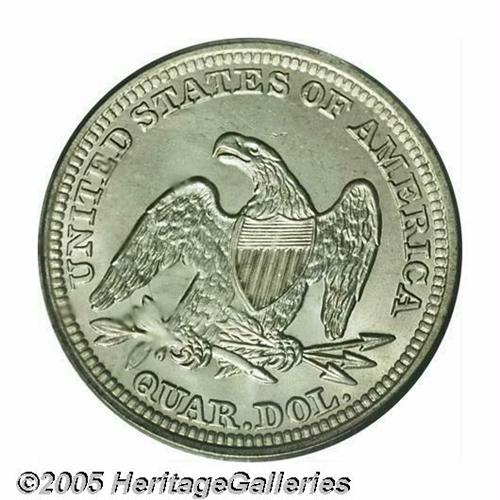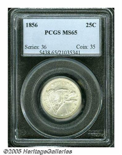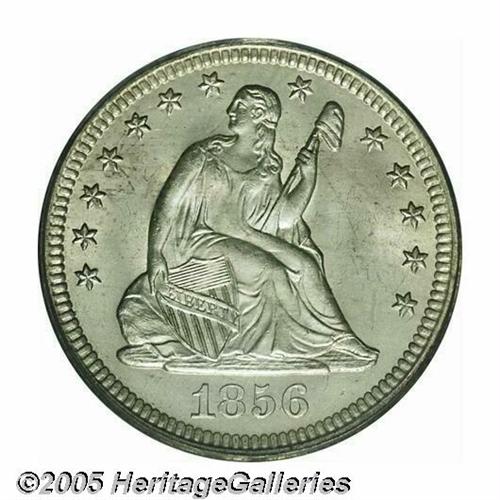 <B>1856<25C> MS65 PCGS.</B></I> An excellent No Motto type coin, this 1856 Quarter is brilliant throughout and every design feature is completely brought up overall. The luster is soft and frosted and there are no objectionable abrasions on either side. Population: 11 in 65, 7 finer (5/05).