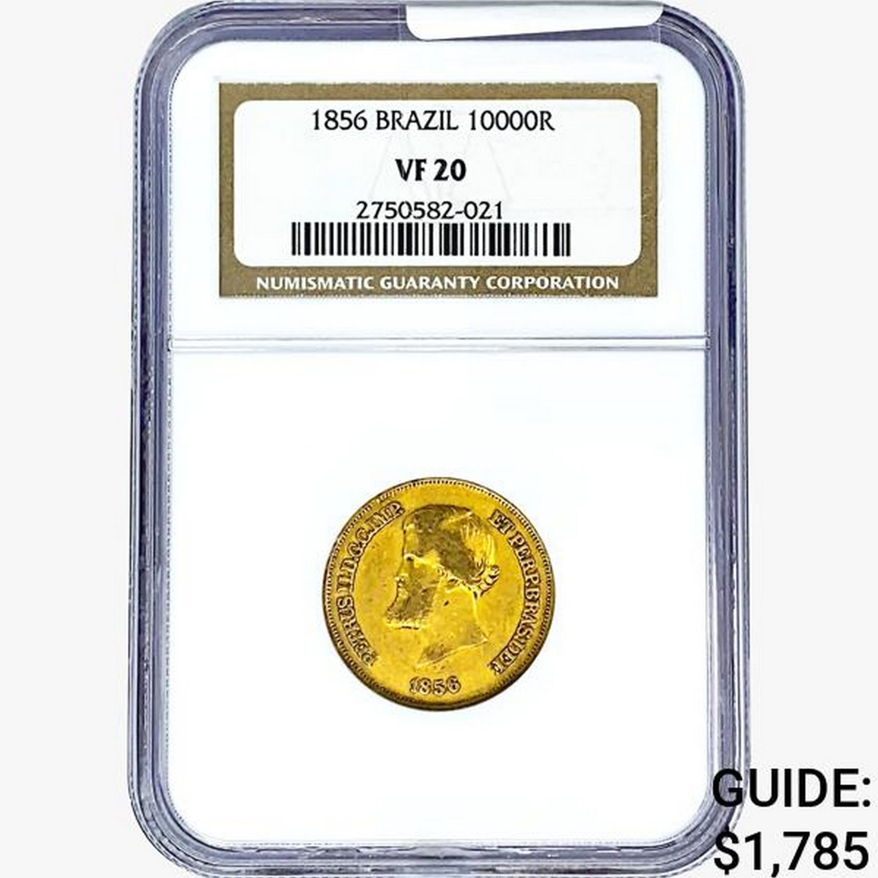 1856 .2643oz. Gold Brazil 10000 Reis NGC VF20
