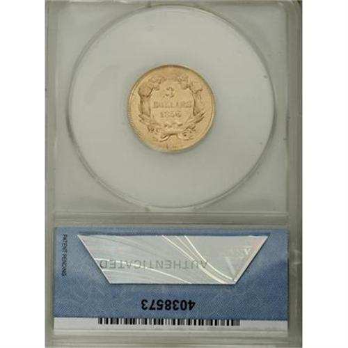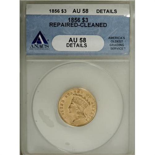 <B>1856 $3 --Repaired, Cleaned--ANACS. AU58 Details.</B></I> The 1856 is conditionally scarcer than its mintage implies. The strike is slightly soft on the curls, but there is little wear. The reverse field is hairlined, and repairs are present near 6 o'clock on the obverse and 12 o'clock on the reverse.<BR><BR><B>Coin Engraver:</B> James B. Longacre<BR><BR><b>Shipping:</b> Coins & Currency (<a target="_blank" href="http://www.heritageauctions.com/common/shipping.php">view shipping information</a>)