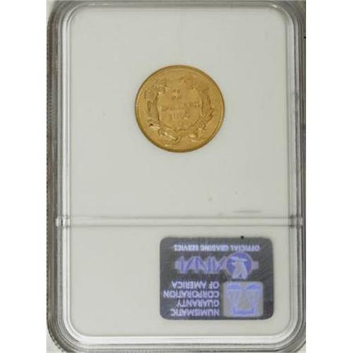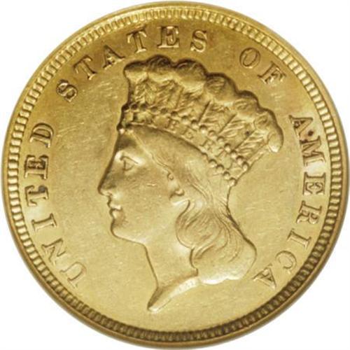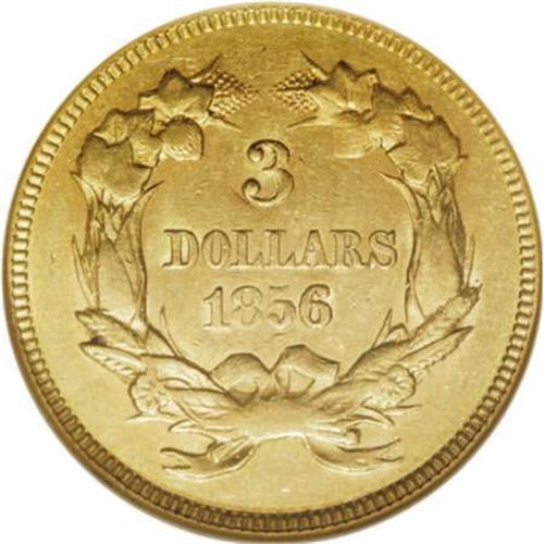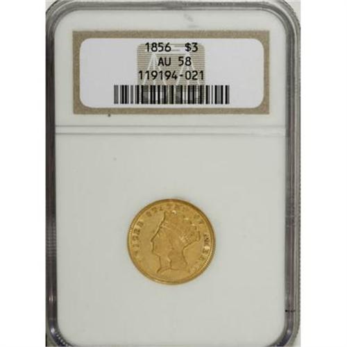 <B>1856 $3 AU58 NGC.</B></I> Examples of this date that survive from the 26,010 coin mintage can be found in all circulated grades as well as the lowest Mint State grades, but higher quality pieces are rarely seen. This near-Mint example provides an excellent value, combining decent quality with reasonable price. Nearly full luster is present on both sides with rich honey-gold color that tends slightly toward green. The surfaces are pleasing with only minor imperfections.<BR><I>From The DAX Collection.</B></I><BR><BR><B>Coin Engraver:</B> James B. Longacre<BR><BR><b>Shipping:</b> Coins & Currency (<a target="_blank" href="http://www.heritageauctions.com/common/shipping.php">view shipping information</a>\)