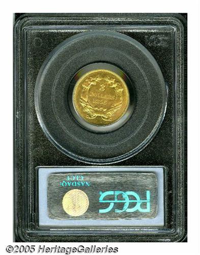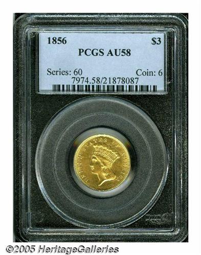 <B>1856<$3> AU58 PCGS.</B></I> Light yellow-gold color with nearly full luster. This is a wonderful example, and it is far scarcer than the 1854 or the other common date issues.