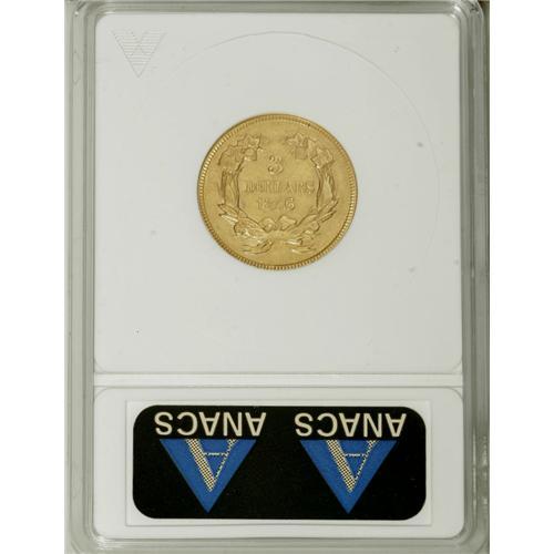 <B>1856 $3 --Cleaned--ANACS. AU53 Details.</B></I> This richly defined and partly lustrous almond-gold example is only lightly cleaned, and the strike is good save for blending of detail on the bow knot.<BR><BR><b>Shipping:</b> Coins & Currency (<a target="_blank" href="http://www.heritageauctions.com/common/shipping.php">view shipping information</a>)