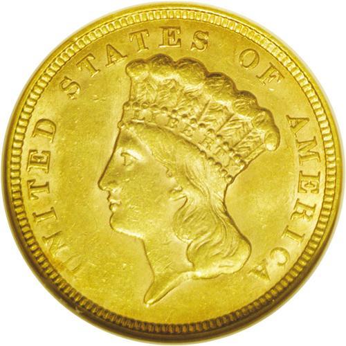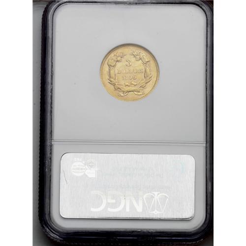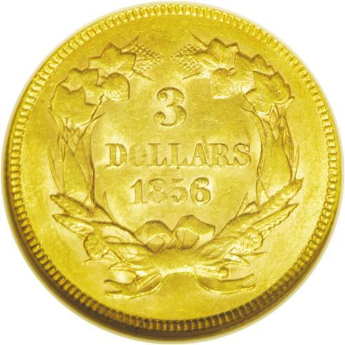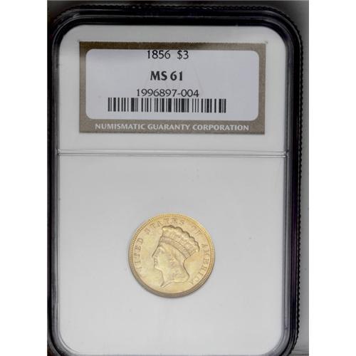 <B>1856<$3> MS61 NGC.</B></I> Modestly lustrous with pink-gold color and numerous small abrasions. The obverse is better defined than normal for the issue, while on the reverse the bow shows some softness. Common in lower grades, this date is quite scarce at all levels of Mint State.