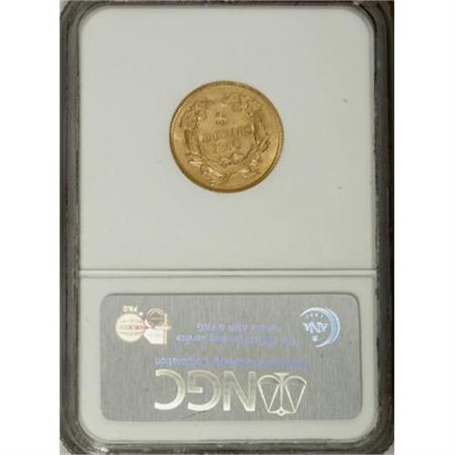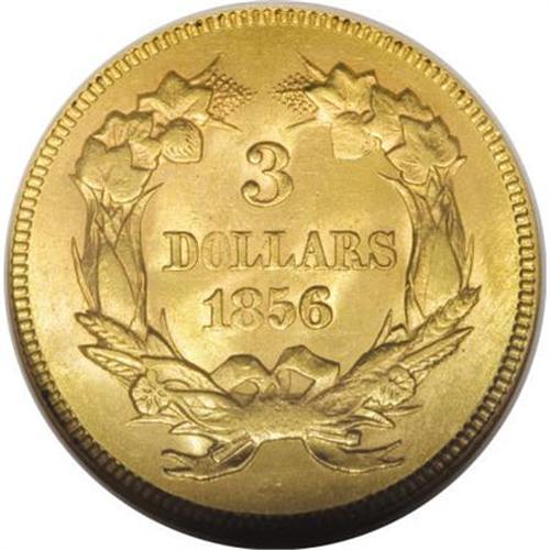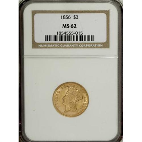 <B>1856 $3 MS62 NGC.</B></I> Among regular issue gold coins, this denomination is the rarest overall. The 1856 three is relatively plentiful in circulated grades, but it is hard to locate in Mint State. The average certified grade is just 54.3, according to Jeff Garrett and Ron Guth, and this is inflated by the rule that higher grade coins are more likely to be submitted and resubmitted. This piece is a splendid representative of the date and denomination with frosty yellow-gold luster and excellent surfaces. Some design weakness is evident on each side.<BR><BR><b>Shipping:</b> Coins & Currency (<a target="_blank" href="http://www.heritageauctions.com/common/shipping.php">view shipping information</a>)