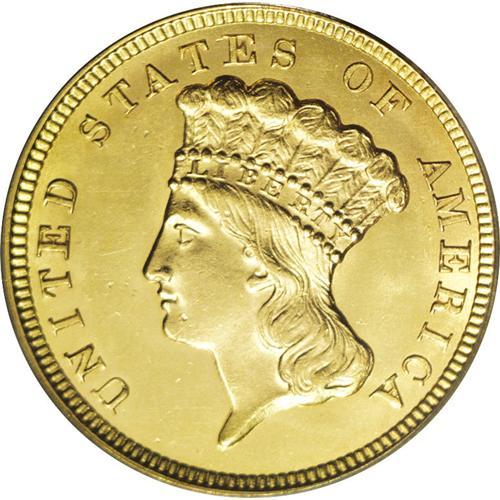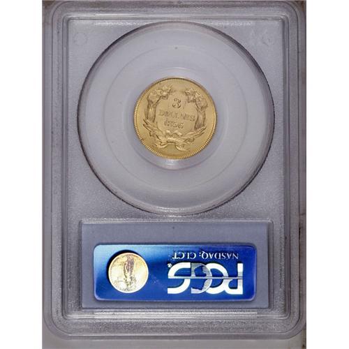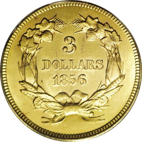 <B>1856 $3 MS62 PCGS.</B></I> The 1856 is only moderately scarce as a date, but strictly Uncirculated pieces can be difficult to locate. Indeed, fewer than 200 pieces have been certified by PCGS and NGC combined. Moreover, most specimens are soft in the headdress and hair curls. This coin displays a better-than-average strike on the design elements, not only on the aforementioned areas, but also in the letters of LIBERTY and on most of the wreath. Apricot-gold color with traces of lime-green dominates each side, which also display decent luster. Minute marks are noted on Liberty's cheek and neck, in the left (facing) obverse field, and scattered throughout the reverse fields.