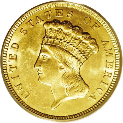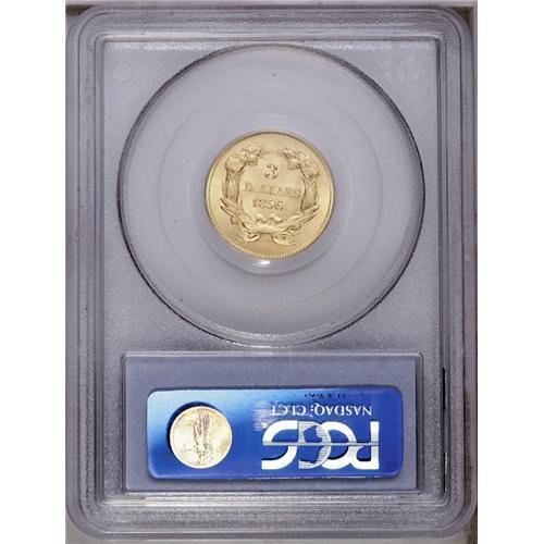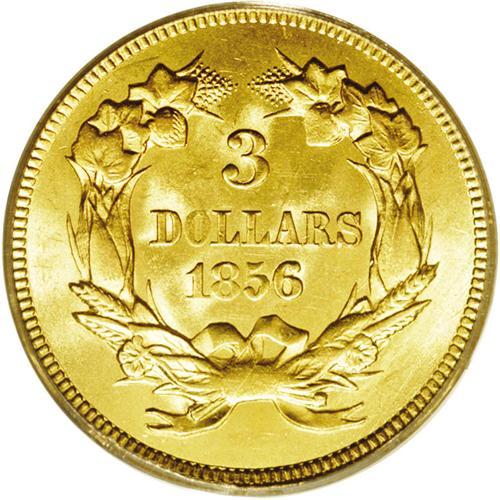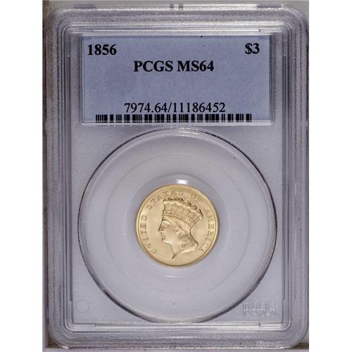 <B>1856<$3> MS64 PCGS.</B></I> This is a remarkable condition rarity, and it is tied for the finest ever certified by PCGS. Although the mintage of 26,010 coins is among the higher mintages for the entire denomination, most examples found their way into circulation prior to the Civil War. A couple minor die varieties exist, although these are not carefully documented with only a brief mention by Breen. This example has the digit 5 upright (as always) and with this digit approximately centered beneath the second L in DOLLAR. Another variety with Large over Small Letters in DOLLARS is only seen on proof examples of this date.<BR> Highly lustrous with brilliant yellow color and frosty surfaces. A few tiny marks are visible in the fields with microscopic hairlines on Liberty's cheek. The reverse has a few similar imperfections scattered about, with a patch of diagonal die polish lines outside the lower right part of the wreath. Most design elements are sharply defined, although the digit 8 and the ribbon knot are each poorly detailed. Population: 14 in 64, 0 finer (3/06). <BR><BR><B>Important notice:</B> Heritage usually auctions material at the rate of 200-250 lots per hour. On some occasions eBay Live bid software or the Internet may not be able to keep up with the pace of the auction. We recommend placing a realistic absentee bid now as insurance to avoid disappointment. Occasionally the auctioneer may eliminate or reject an eBay Live bid, and the auctioneer may also reopen a lot after the close of the eBay live bidding (usually because we missed an audience bid), and may reject your bid even if it shows you as the winning bidder. By bidding via eBay Live, you agree that Heritage may award the lot to another bidder at its sole discretion under the circumstances described above or any other reasonable circumstances. Since eBay bids are not shown to us until we open the lot on the floor, we treat those bids just like floor bids. In most cases the floor responds before the eBay bid is presented to us, due to Internet lag time, so for consistency we have made it a policy that floor bids are always considered first over tie eBay live bids. Also please note that all Heritage lots purchased through eBay Live carry a 20% Buyer's Premium. Please make sure you read the Terms and Conditions before you bid. This lot is being auctioned in conjunction with a live floor auction by Heritage Galleries & Auctioneers. All final auction and invoice information will be supplied by Heritage Galleries & Auctioneers, and all other information should be considered preliminary. Lot:2567 <BR><BR><B>Winning Notification and Billing:</B> After the FINAL session in this auction is complete, Heritage will send e-mail and snail mail invoices. This process normally takes several days. All final auction and invoice information will be supplied by Heritage Galleries & Auctioneers, and all other information should be considered preliminary. <BR><BR>This auction will be conducted on a live auction floor and over the Internet through eBay Live. If you choose to place an absentee bid, please take a moment to <font color='#0000ff'><u><a href='http://pages.ebay.com/liveauctions/help/before/laabsentee.html'>learn how eBay Live absentee bidding works</a></u></font><font color='#000000'>