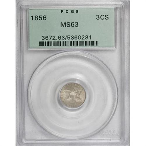 <B>1856 3CS MS63 PCGS.</B></I> PCGS Population (54/93). NGC Census: (56/98). Mintage: 1,458,000. Numismedia Wsl. Price for NGC/PCGS coin in MS63: $600. (#3672)<BR><BR><B>Coin Engraver:</B> James B. Longacre<BR><BR><b>Shipping:</b> Coins & Currency (<a target="_blank" href="http://www.heritageauctions.com/common/shipping.php">view shipping information</a>)