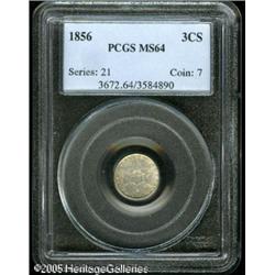 <B>1856 3CS MS64 PCGS.</B></I> The Act of March 3, 1853 changed the composition of the three cent silver from 75% silver, 25% copper to 90% silver, 10% copper. In order to denote this change, Longacre added two extra outlines to the obverse star, as well as an olive branch and a bundle of arrows within the C on the reverse. This Type Two design was used from 1854-1858 and, since mintages were limited, these issues are the most difficult to obtain for type purposes. This is an unusually well defined example that has bright, glittering mint luster with an overlay of rose-golden toning on the obverse and lilac patina on the reverse. Lot:5651