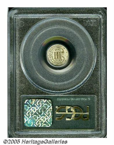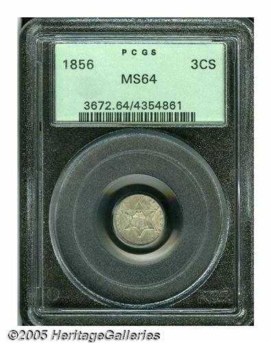 <B>1856<3CS> MS64 PCGS.</B></I> This trime has frosty surfaces with speckled olive-tan patina on the obverse and splashes of gold over the reverse. The shield and the III are well defined, but the remaining design elements are unevenly struck. There are no mentionable marks to report. Population: 57 in 64, 23 finer (4/05).