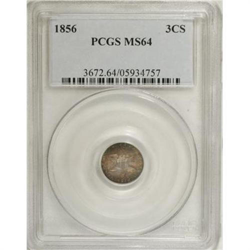 <B>1856 3CS MS64 PCGS.</B></I> Pumpkin-gold, ruby-red, and aquamarine patina endows this refreshingly mark-free near-Gem. The shield is sharply impressed for a business strike, although portions of the peripheries are incomplete.<BR><BR><b>Shipping:</b> Coins & Currency (<a target="_blank" href="http://www.heritageauctions.com/common/shipping.php">view shipping information</a>)