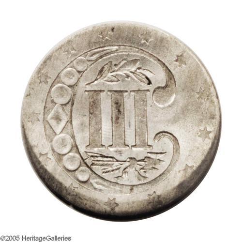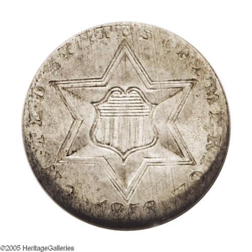 <B>1856<3CS> MS65 NGC.</B></I> A lustrous and well preserved cream-gray Gem. Sharply struck on the major devices; softness is noted on the peripheral elements. A few interesting die lines (as made) intersect near the shield border. Quite scarce at the MS65 level, and in demand as a high grade example of the scarce Variety Two design. Census: 15 in 65, 4 finer (10/05).