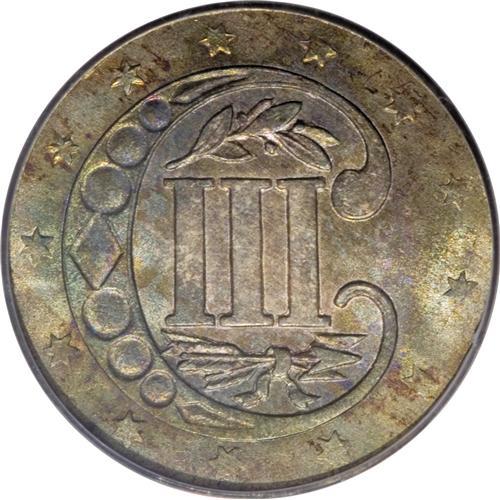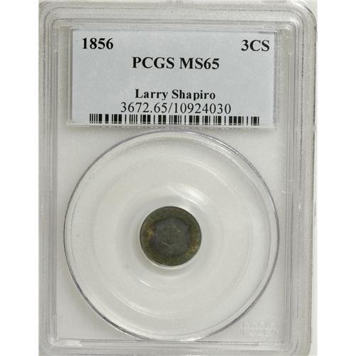 <B>1856 3CS MS65 PCGS.</B></I> Ex: Larry Shapiro. Well struck with scintillating luster at the olive-toned periphery. The center of the obverse displays intense cerulean patina, while the reverse has delicate aqua color. By 1854, the composition of the three cent silver piece changed from the .750 fineness that allowed it to circulate earlier to the .900 standard. Population: 21 in 65, 3 finer (4/07).<BR><BR><b>Shipping:</b> Coins & Currency (<a target="_blank" href="http://www.heritageauctions.com/common/shipping.php">view shipping information</a>)