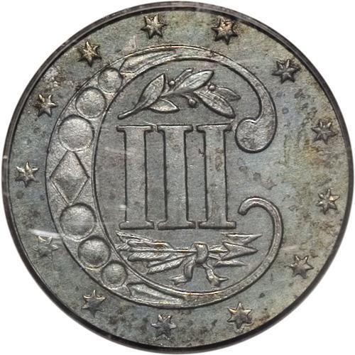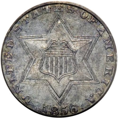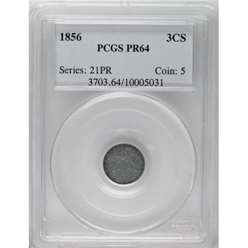 <B>1856 3CS PR64 PCGS.</B></I> We do not know how many proof three cent silvers were produced in 1856, but Breen (1977) does speculate that 30-40 pieces are extant. Since several of the survivors are impaired to one degree or another, the present near-Gem is undoubtedly one of the finer representatives available to today's specialists. This is a richly toned sea-green and golden-brown example with hints of underlying reflectivity. The major devices are well struck, while letters and stars near the border show occasional softness. Population: 8 in 64, 3 finer (9/06).<BR><I>Ex: Wayne S. Rich Collection (Bowers and Merena, 3/02), lot 1438, which sold for $5,750.</B></I><BR><I>From The Jones Beach Collection.</B></I><BR><BR><b>Shipping:</b> Coin/Currency (<a target="_blank" href="http://www.heritageauctions.com/common/shipping.php">view shipping information</a>)