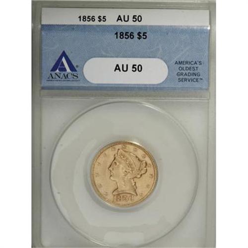 <B>1856 $5 AU50 ANACS.</B></I> . NGC Census: (33/219). PCGS Population (48/98). Mintage: 197,990. Numismedia Wsl. Price for NGC/PCGS coin in AU50: $292. (#8266)<BR><BR><B>Coin Engraver:</B> Christian Gobrecht<BR><BR><b>Shipping:</b> Coins & Currency (<a target="_blank" href="http://www.heritageauctions.com/common/shipping.php">view shipping information</a>)
