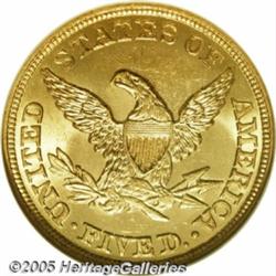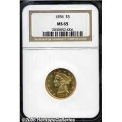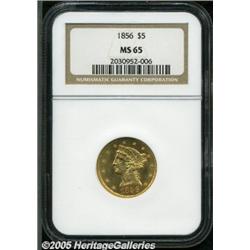 <B>1856 $5 MS65 NGC.</B></I> This is an amazing rarity in Gem condition. In fact, any Mint State example of this date is elusive. Our Permanent Auction Archives, recording the past dozen years of rare coins sold by our firm in all of our auctions, reveals that the previous best example of this date that we have offered was an MS62 grade coin! Just 197,900 examples were coined, and only four Gem quality coins have been certified by the two major grading services, with only a single Gem graded by PCGS. Not only will specialists in the series be excited by this offering, but type collectors will also consider this an important opportunity. Just 79 examples <I>of the entire design type</B></I> have been certified by PCGS and NGC in MS65 or finer grades.<BR> This example is highly lustrous with satiny yellow-gold surfaces and traces of pinkish toning. It is sharply struck, although not fully defined. The top hair details, as well as the top of the coronet, are softly defined with a couple hair strands merged together. On the reverse, the eagle's claws and the arrow feather are weakly impressed. Population: 3 in 65, 0 finer (2/05).
