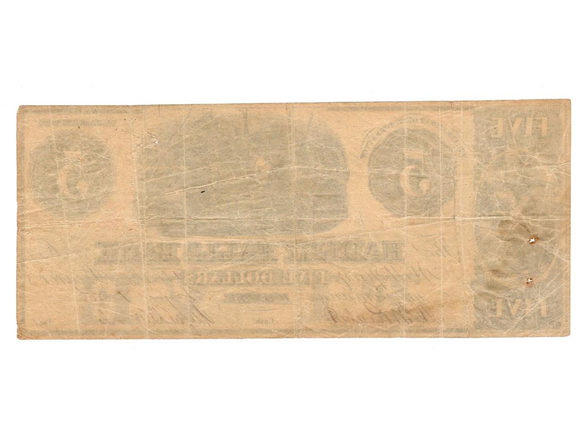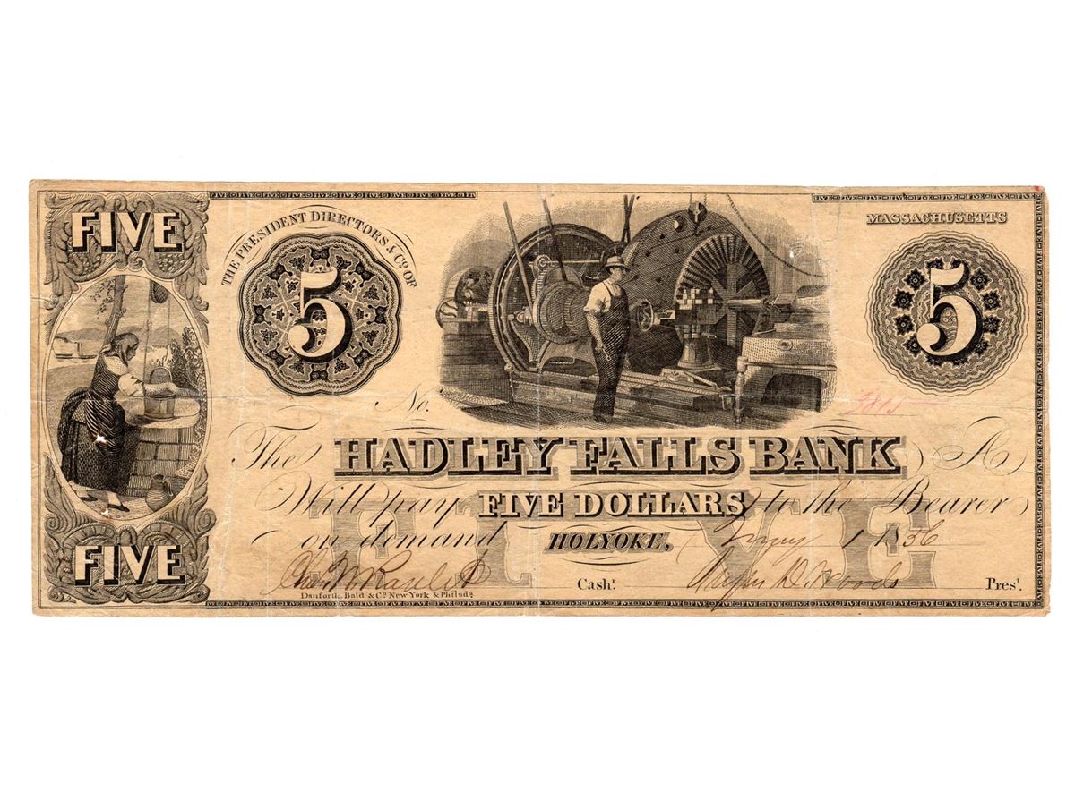 One 1856 $5 The Hadley Falls Bank Obsolete Bank Note.