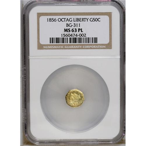 <B>1856 50C Liberty Octagonal 50 Cents, BG-311, Low R.4, MS63 Prooflike NGC.</B></I> The moderately reflective yellow-gold fields contrast with the devices, which possess modest frost. An interesting octagonal half. Census: 2 in 63 Prooflike, 0 finer (12/06).<BR><BR><b>Shipping:</b> Coins & Currency (<a target="_blank" href="http://www.heritageauctions.com/common/shipping.php">view shipping information</a>)